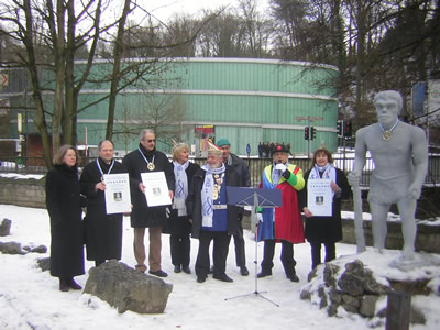 des Neandertals. Bei winterlichen Temperaturen waren viele Gäste anwesend, unter anderem der Vizepräsident des RBM, Hartmut Forchert, aus Wuppertal und aus Köln waren angereist, der Enkel des Schöpfers der Neandertalerfigur, Dr. Josef Moch mit Frau. Ebenfalls vor Ort war Peter Pose, der den Antrag stellte die Skulpur des Neandertalers unter Denkmalschutz zustellen. Dieser wurde abgelehnt, hat aber dazu beigetragen die Öffentlichkeit mit ins Boot zu holen. Heimatvereine haben sich in die Pflicht genommen, dieses Thema zu bearbeiten. Somit konnte Präsident Dieter Schumacher weitere Gäste begrüßen, den Bürgermeister der Neanderstadt Mettmann, Herrn Bernd Günther und die 1. Stellv. Bürgermeisterin der Stadt Erkrath, dem Tor zum Neandertal, Frau Edeltraud van Venrooy. Der Hoppeditz der Stadt Erkrath und Ehrenpräsident der Gesellschaft Richard Voges hielt die Laudatio zur Würdigung des neuen Ehrensenators. In launigen Ansprachen der Bürgermeister und Herrn Dr.Moch wurde die „ Ehrensenatorenwürde “ nochmals humorvoll unterstrichen und für eine wichtige und richtige Endscheidung betitelt. Den Bürgermeistern der Städte Mettmann